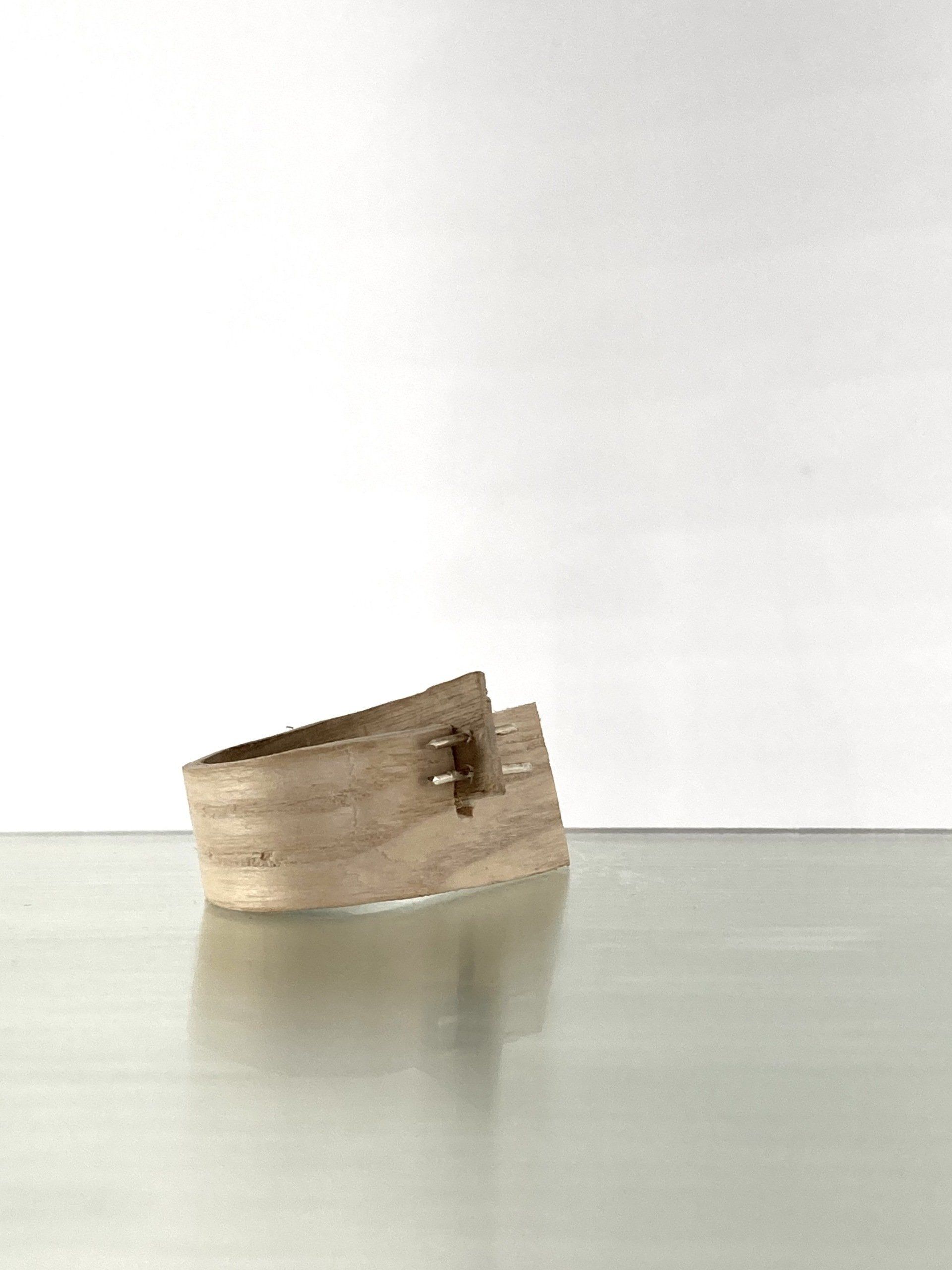 Hierbei wird das Holz mit Hilfe von heissem Wasserdampf biegsam gemacht, in die Form gebogen und getrocknet. Ähnlich wie bei einer Dauerwelle. Die Auswahl des Holzes ist hierbei von grosser Wichtigkeit. Bei der groben Bearbeitung des Holzes verwenden wir keine Säge, sondern spalten das Holz mit dem Wuchs.